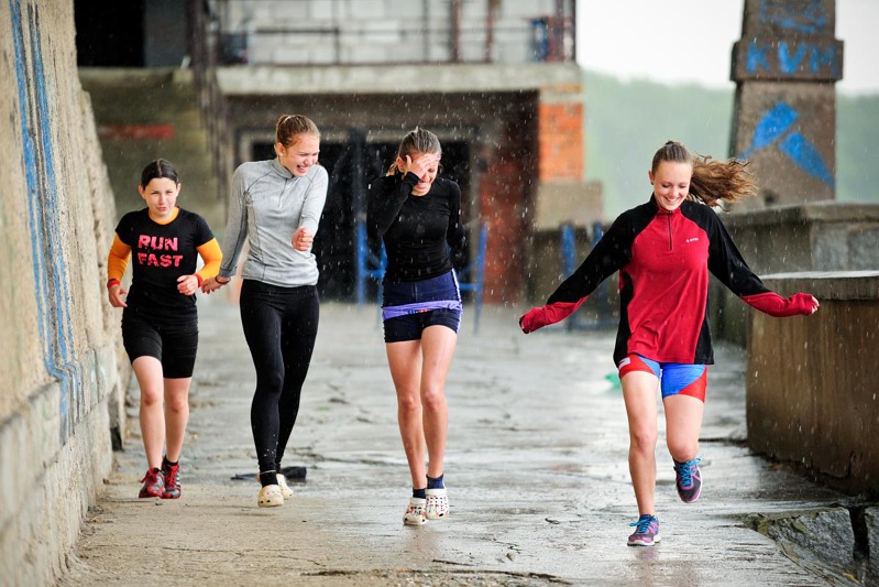 Foto Petr Luňák: Fotka z 1. května 2014 při náhlé průtrži mračen na dosah Klubu veslařů mělnických. Děvčata měla co dělat, aby jim neodplavala veslice, proto ten spěch. Na fotce sprintují Eliška Tichá, Anička Macková, Adél Walterová a Lucie Műllerová.